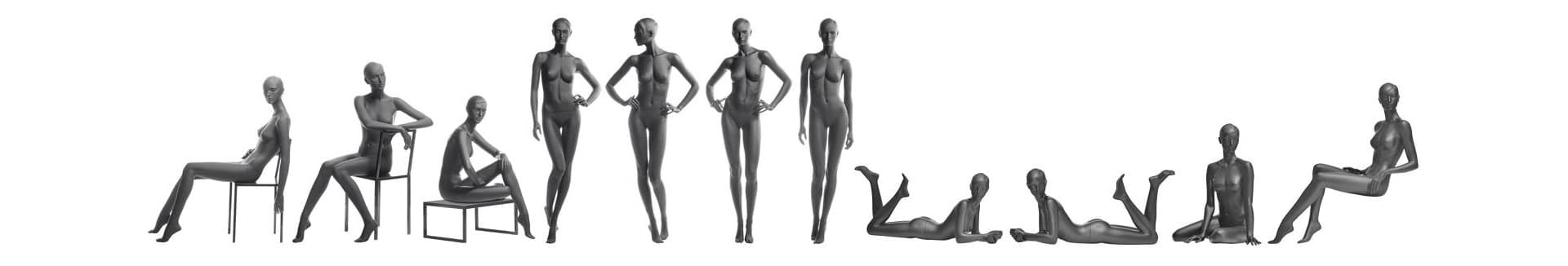 The PURE series of mannequins represents the mature elegant woman of today. The elegant silhouettes are forceful yet refined. The collection is made up of both relaxed and catwalk attitudes. The collection has 4 different styles of head spread over the 24 positions.