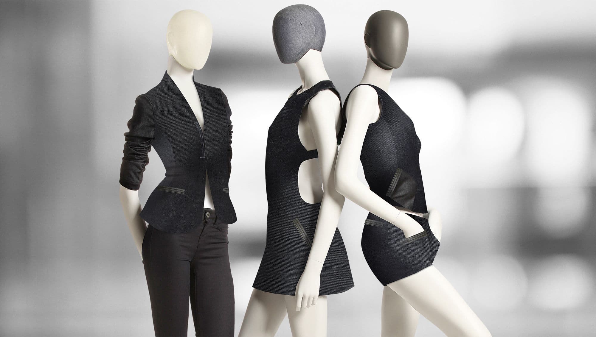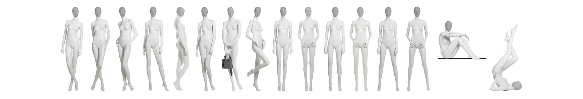 The collection 82 ABSOLUTE CAMELEON is the ABSOLUTE collection but with REMOVABLE HEADS. Heads are available in painted finishes, covered with cloth, in gloss or matt translucent resins or in a range of solid woods. The collection has been designed essentially for sportswear and jeans, but lends itself also to ready to wear. The positions are divided into two groups - straight rigid positions inspired by web shopping poses, and young assertive female attitudes.