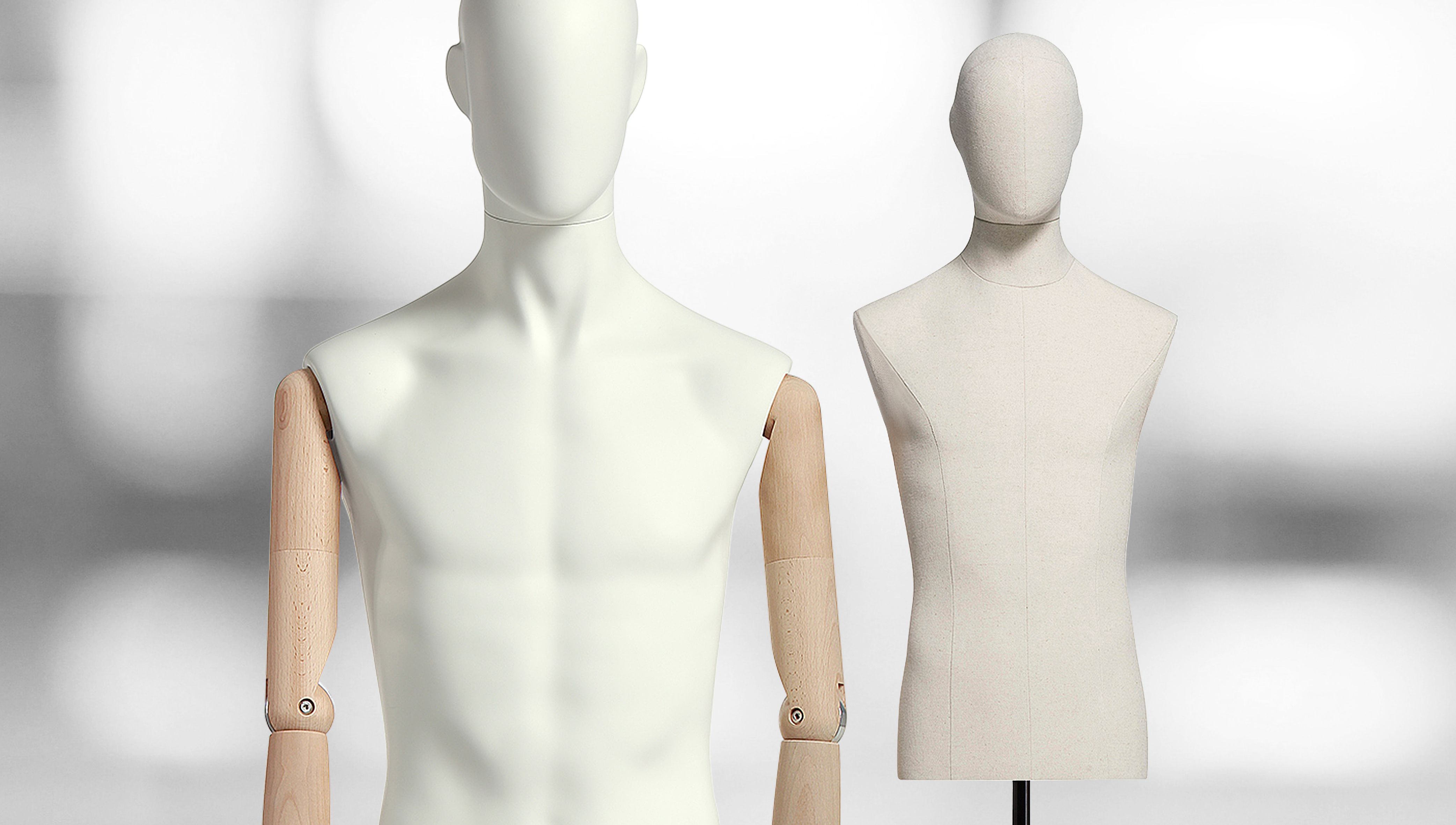 COLLECTION 89. ABSOLUTE VINTAGE - BUSTS CONTEMPORARY VINTAGE ! The collection 89 VOGUE VINTAGE is a selected pose from the Vogue collection with wooden articulated arms. The collection is available either with fabric covered busts and heads or with painted busts and heads. These beautifully finished mannequins are an interesting fusion of contemporary styling and traditional vintage materials. They come in matt white, off-white cotton canvas and arms are made of beech wood. They match up with the female collection of busts. The busts have removable heads and can be used headless with painted or fabric neck covers.