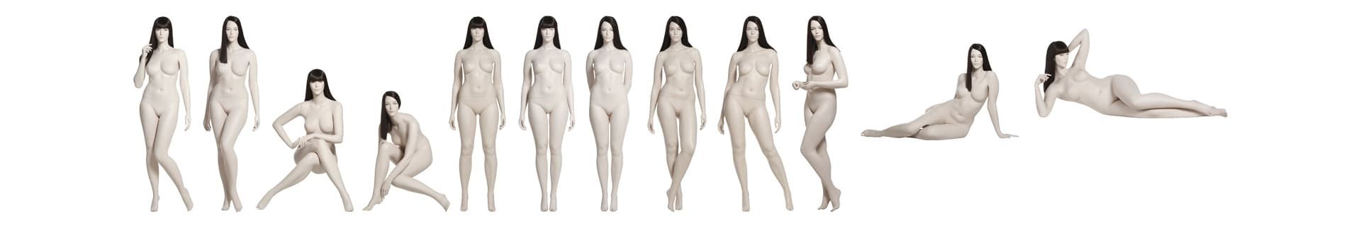 The collection 91 VOLUPTUOUS marks a new generation in plus size mannequins. Voluptuous curves with hoards of feminine charm. A year of studies and creative research has given birth to beautiful natural poses, making it today the worlds ‘most extensive plus size collection. The collection has been carefully designed to make the plus size women of today proud of their generous proportions and their femininity. Positions have been developed for ready to wear, jeans and lingerie.